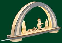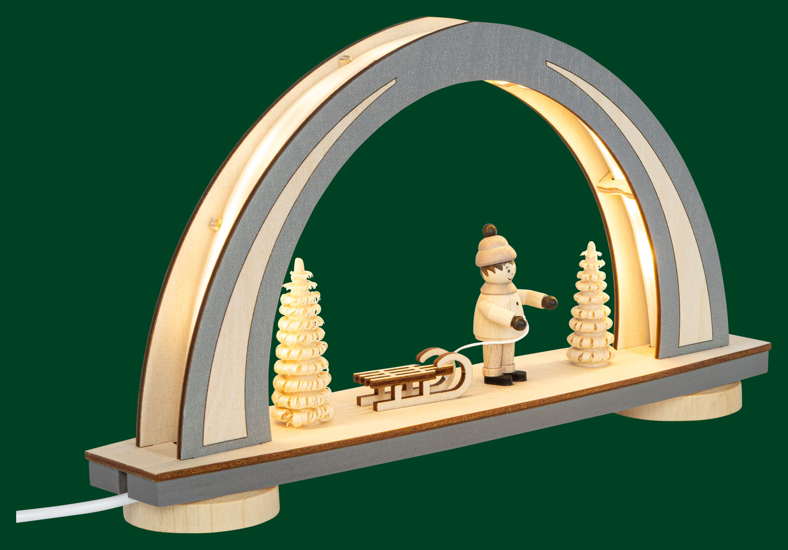 LED Mini-Schwibbogen - NEW LINE "Winterkind m. Schlitten", "Original Tietze Figur", USB-Anschluß inkl.Netzteil, Grau/Natur