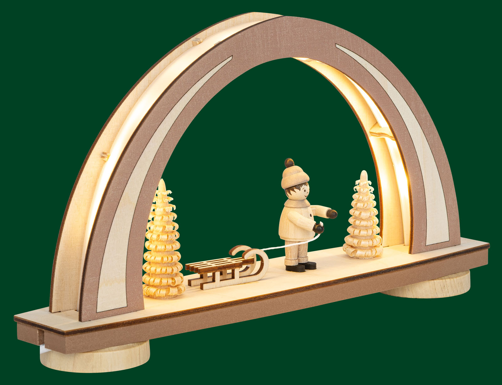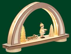 LED Mini-Schwibbogen - NEW LINE "Winterkind m. Schlitten", "Original Tietze Figur", USB-Anschluß inkl.Netzteil, Mocca/Natur